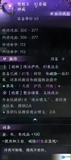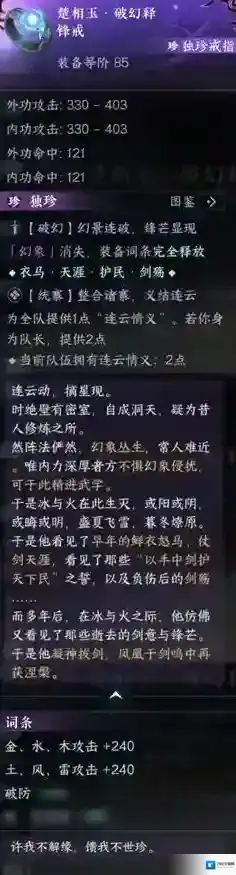 使用太白残锈与连云寨山洞探索获取的独珍楚相玉·幻景凝神戒加工,可逐步破除其幻象。最终,您将获得一件集太白剑意与楚相玉功力于一体的强大装备(需要四周时间)。
