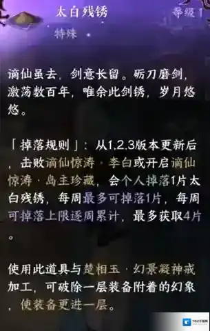 同时,您还将收获特殊材料太白残锈(必定掉落)。此锈原为李白砺刃磨剑所留,锈粒坚硬粗重,本无大用,但对于另一件苦于被“幻象缠身”的装备来说,反倒成其破除层层幻象的利器。