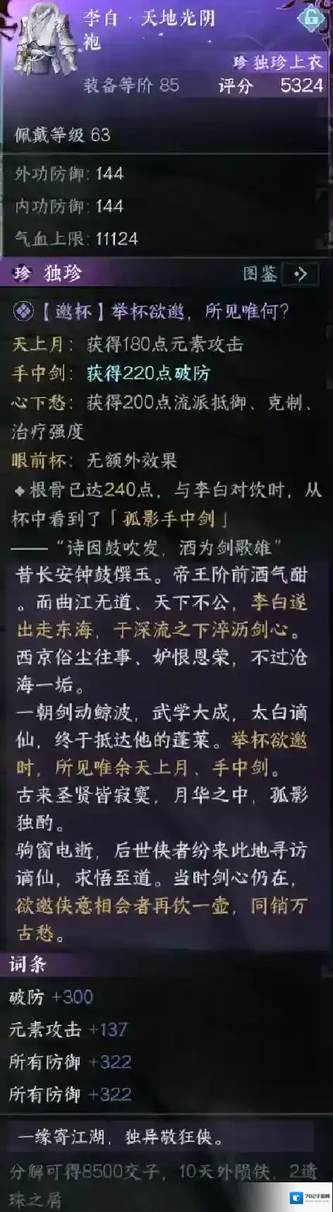 这件李白·天地光阴袍,隔着老远就能感受到强大的气场,可其中奥妙似乎需要穿戴者的身法、根骨达到一定境界后方可参悟。这可能就是所谓的“谪仙”吧,小寒我是想不明白了。