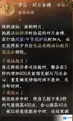 第三关:谪仙人李白谪仙,意思是神仙被贬入凡间。历史上被文人墨客追捧为“谪仙”的或有几人,但唯一没有争议的一定是李白,是诗仙,也是剑仙。钟鼓馔玉不足贵,面对天下的不公,李白的才情让人惊叹,留下了诸多名篇。古来英雄皆寂寞,月光中,李白孤影独酌,欲邀真正的侠士共饮,淬炼剑意,消解愁绪。晚年时,李白东渡谪仙于海下闭关十二载,一朝破水而出,大道顿彻,忘却凡俗荣辱,终究武学大成,自此大笑而去。或化沧溟、或化岛礁、或化明月,无所可寻,唯其剑魂刀意,萦于东海之滨,激荡数百年,砺成碎梦、龙吟两派,千秋万载,共奉为宗。