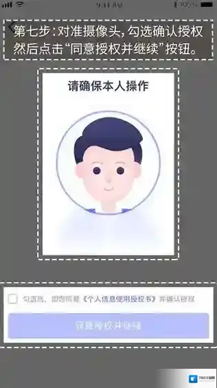 7、对准摄像头,勾选确认授权然后点击“同意授权并继续”按钮进行人脸识别。