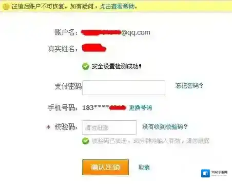 7、输入支付密码以及需要绑定的手机接受一个效验码。全输入正确后点击“确认注销”。