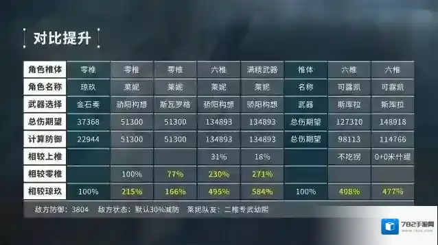 莱妮6+6由于能够刚好达到常驻额外200%无视防御,提升幅度可以说是继春田专武之后满精提升第二大的专武了。
