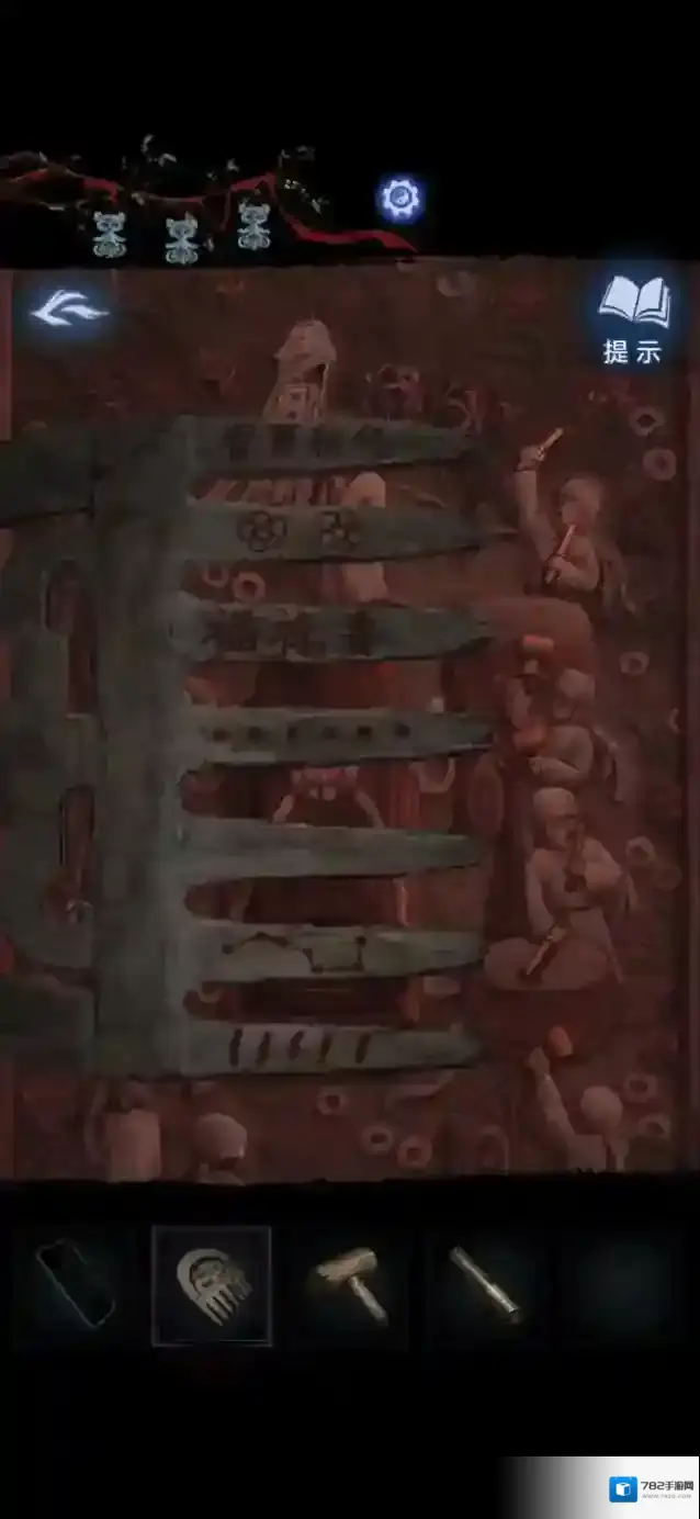 把骨头饰品给莫黎,根据浮雕上的画和奇怪道具比对,可以得到敲钟顺序,铜铜木铜木木铜,敲完获得兽牙饰品
