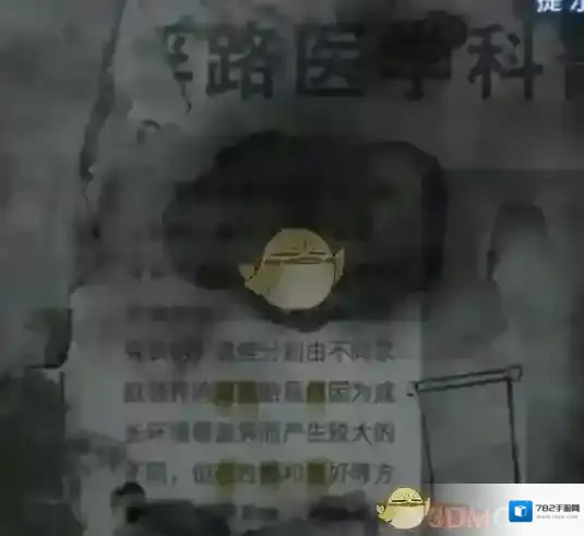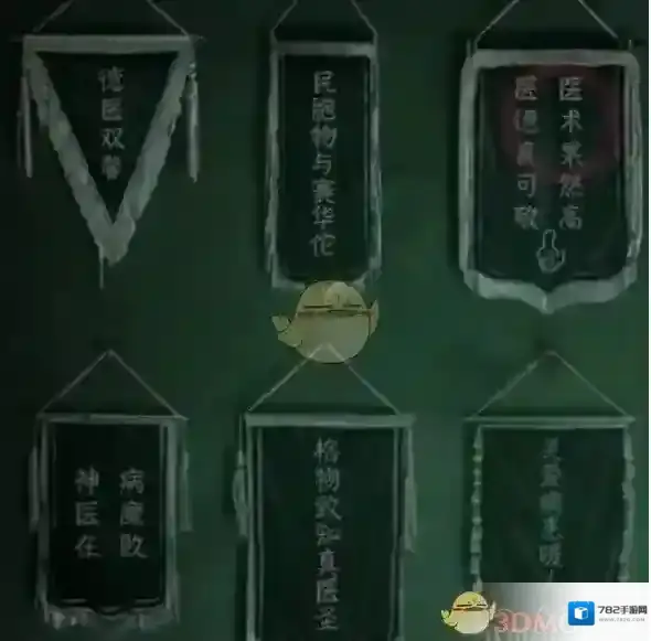 查看右边办公室的门,用医用钳开门,注意天花板小高能,开门进入办公室,查看左边的墙上挂上两面锦旗,但是还需要调整位置,查看右边墙上贴的纸条,重点是几个标了黄色的字,记下来双胞然在格爱。
