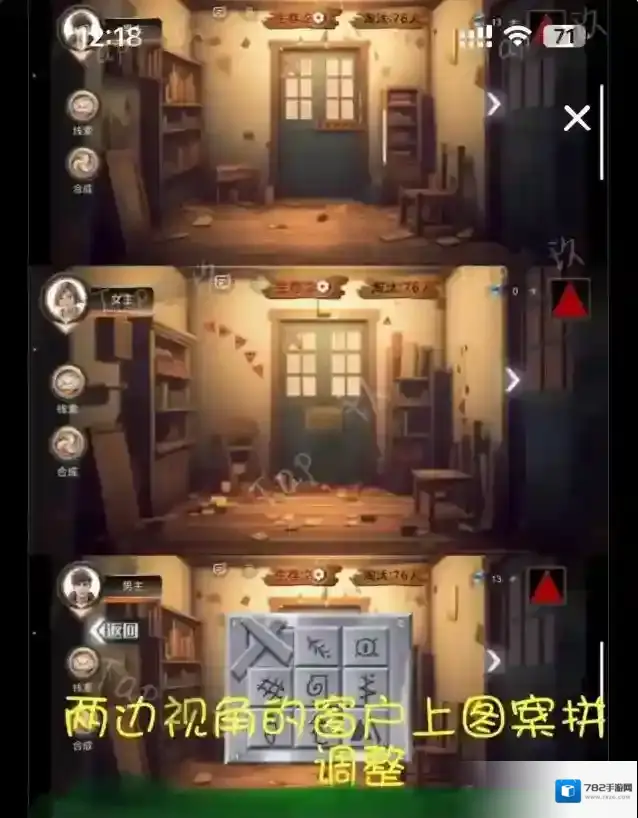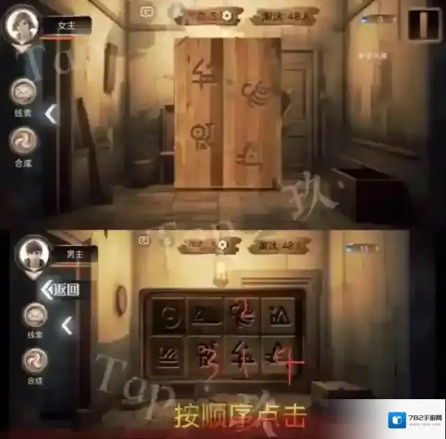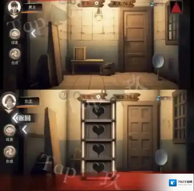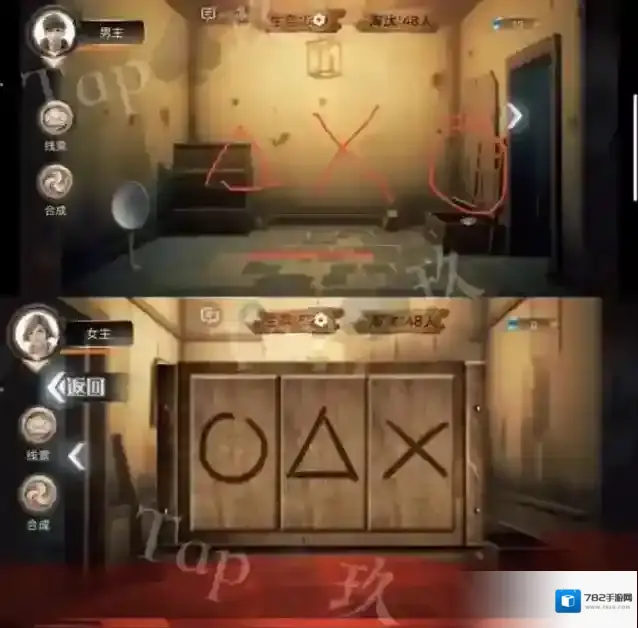2-地上拾取左大三角木牌传给女主。点击左边屋子箱子显示(男左女右,男右女左),结合男女主视角灯的形状,按数字顺序依次点击,获得左竖木牌,将其放到门上。获得女主左侧房间线索我不知道