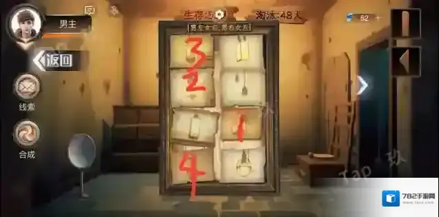 2-根据男主视角左侧房间墙上的线索,打开右侧柜子,获得豆腐(珠串排列4312个珠串)