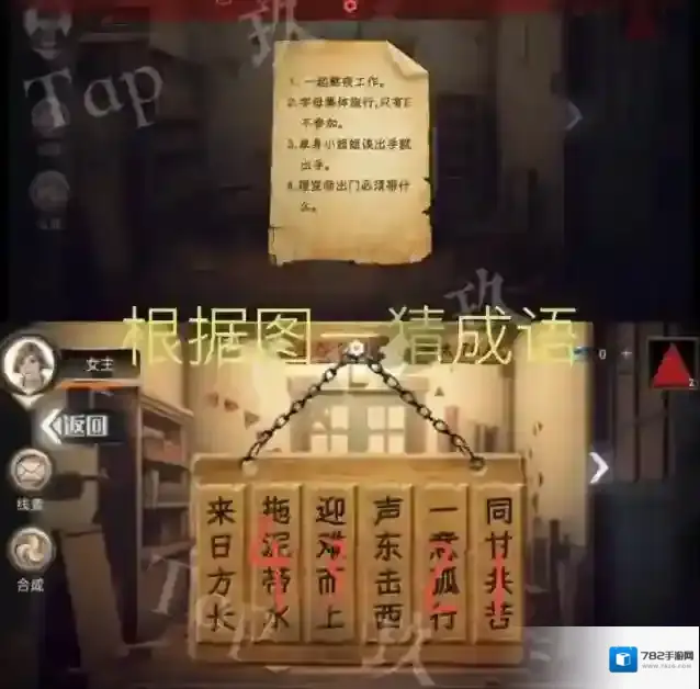 1-根据女主左侧墙上的木块字符按图中数字顺序点击,获得右竖木牌,把其放到门上