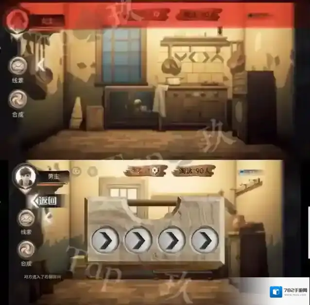4-把所有的箭头木板连同男主传递过来的,放在门上,根据男主视角左边屋子左侧柜子上的线索调整(↙←→↑),门打开了。