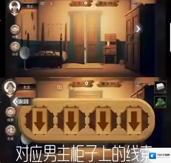 2-根据女主墙上箭头提示打开右侧的柜子(↓←→↑),获得箭头木板传给女主。菠菜。