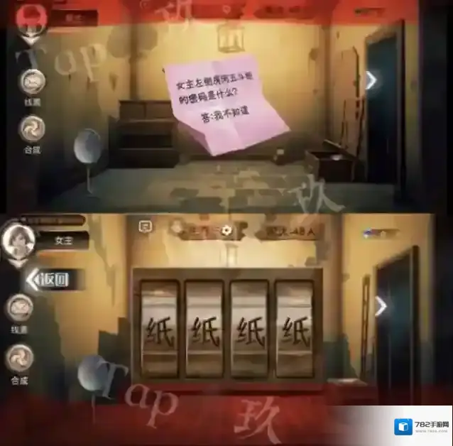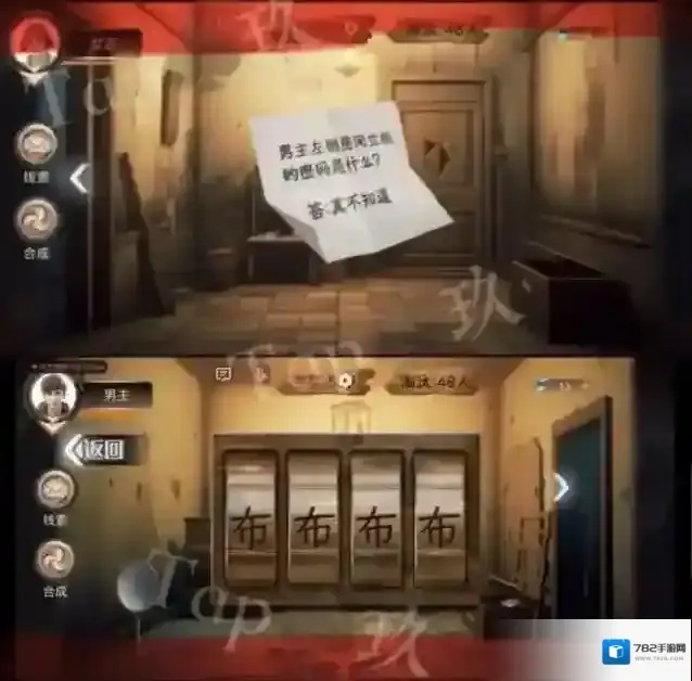 4-根据男主提供的密码我不知道使用谐音梗卧布纸叨打开左侧房间柜子抽屉的机关,获得右大三角牌,放到门上。