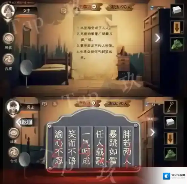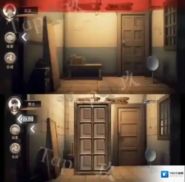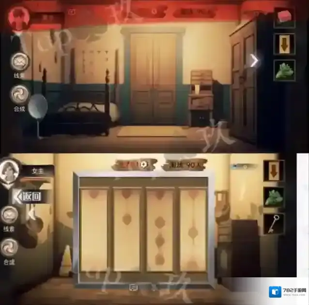 3-根据女主提供的线索(真不知道)打开左侧房间柜子上的机关,获得上半圆木牌,将其连同女主传送过来的中竖木牌放到门上,获得钥匙出门。这里用的是谐音梗贞布纸叨