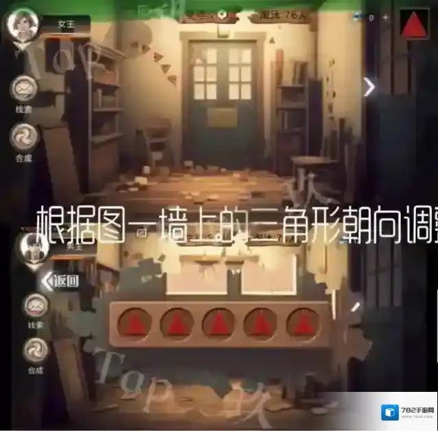3-使用女主传送的蓝色钥匙打开左边房间柜子处的蓝色盒子,获得红色三角。把所有的红色三角连同女主传送过来的三个,一起放在门上,根据女主提供的线索(左右右下左)调整,房门打开。