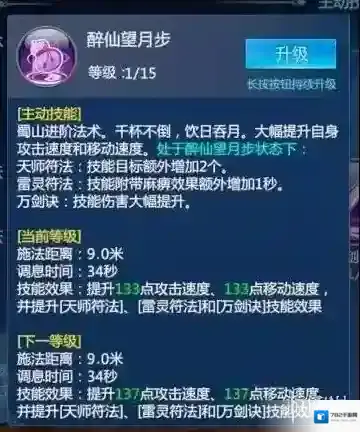 简评:也就是说在血量低于30%是会获得一个不会消失的醉仙望月步效果,在刷野怪的时候其实并不会掉很多血,但是在神魔战场、仙斗会此类活动中增益效果会比较明显,建议点一级就可以了。