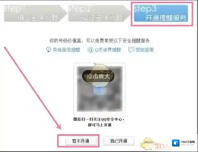 10、进入到第三步,开通提醒服务,我这里选择不开通,开通后,有异地登录,手机就会收到异地登录提醒。如果要开通,手机微信扫一扫关注安全中心即可。