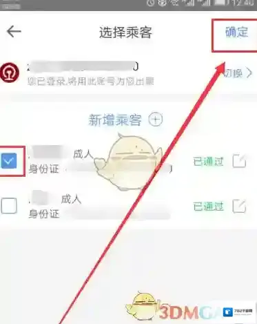 5.弹出乘车人选项界面,选择需要购买车票的乘客,够选好后,点击确定添加即可