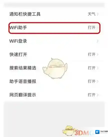 6、进入打开的页面后我们就可以看见“wifi助手”,而这时可以看见它的右边显示的是“打开”状态;