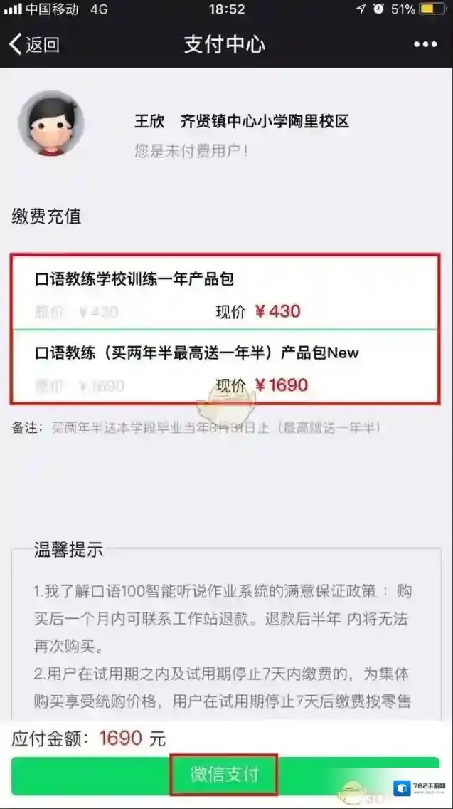 开通口语100的VIP,需要通过微信公众号来进行。关注公众号后,在微信中进行VIP的开通。