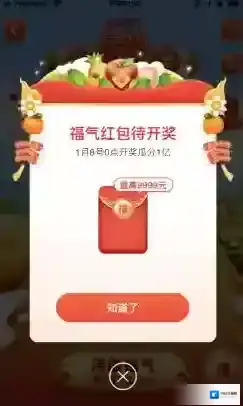 3、1月8日0点至1月10日24点,福气红包开奖,瓜分1亿,种福果的红包,最多可得9999元。