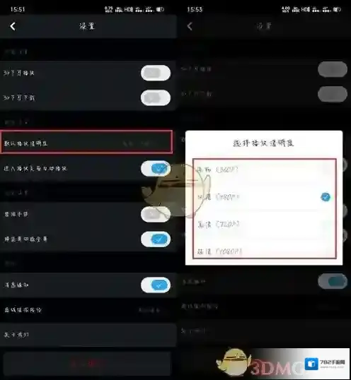 7、点击默认播放清晰度,将其修改为需要的视频清晰度,之后只要不手动修改设置、播放视频的中的清晰度,默认使用该清晰度播放视频、下载视频。