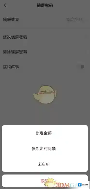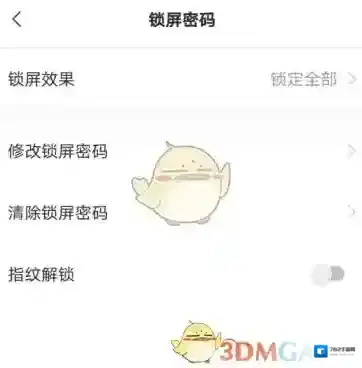 5、锁屏效果显示为“锁定全部”,可修改锁屏效果为“仅锁定时间轴”或“未启用”,可以修改锁屏密码或者清除锁屏密码,也可以勾选开启指纹解锁;