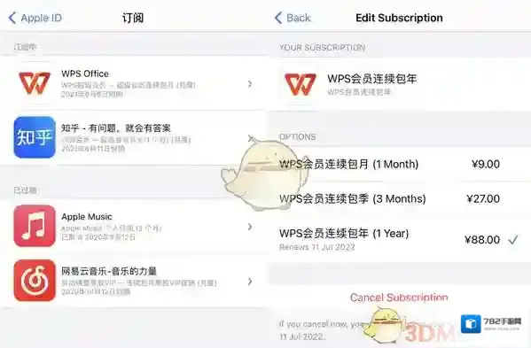 iOS取消:在设置中点击Apple ID,点击订阅,然后关闭WPS自动续费即可。
