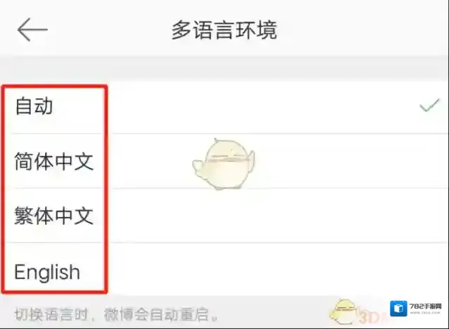 5、选择想要设置的语言即可,选择完后微博会重启。