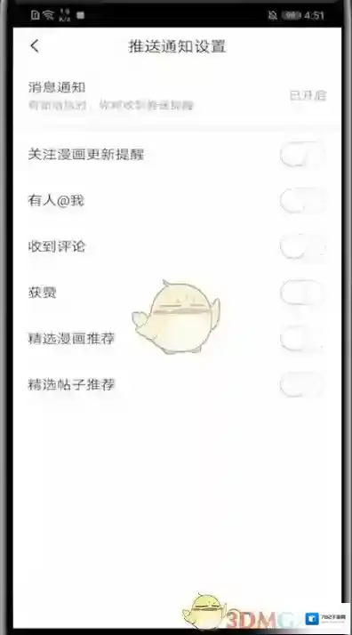 《快看漫画》消息通知关闭方法 2025-07-19 16:26:46 编辑:小镜子 分类:应用教程 • 阅读:111 1、打开快看漫画,点击右下角我的 2、点击设置 4、将所有选项取消勾选即可。 本文内容来源于互联网,如有侵权请联系删除。 快看漫画应用相关内容 全部 快看漫画消息通知 快看漫画点击 快看漫画勾选 快看漫画 快看漫画来源于 《快看漫画》看视频方法 进入快看页面,点击上方的视频即可查看。无论是挤在地铁上还是公交车上,都可以快速轻松的阅读,但还是需要注意安全。值得一提的是,快看漫画app还每天向用户推荐超级精彩的小漫画。些短小精悍的漫画能让你看完之后想追随作者,期待做出新的作品,而且一经推出,就让... 2025-09-07 《快看漫画》夜间模式关闭方法 1、先点击下方“我的”选项,进入个人页面。 2、接着在个人页面中选择“设置”功能,进入设置页面中。 3、之后在设置页面里就可以关闭开启夜间模式。 本文内容来源于互联网,如有侵权请联系删除。 2025-09-07 《快看漫画》弹幕关闭方法 2、而在打开漫画阅读界面之后,点击左侧已经勾选过的“弹幕”选项(如下所示),这样就能够成功的关闭弹幕显示了,想专心阅读漫画的朋友都可以来试一试! 本文内容来源于互联网,如有侵权请联系删除。 2025-07-14 发表回复 请登录后评论... 登录后才能评论 评论列表 (0条)