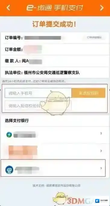 7、此外,在处罚决定书页面下,输入决定书号、校验码,也可对对应违法记录进行缴费操作。根据缴费页面提示,输入手机号、短信校验码、支付卡号与支付密码等信息,即可完成支付。