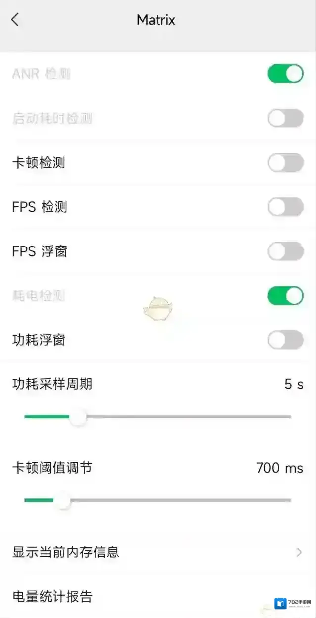 6、之后就会进入Matrix页面,在这一界面中,微信提供了卡顿检测、FPS(帧数)检测、功耗检测等等功能: