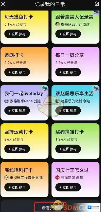 6、回到记录我的日常,点击查看更多。这里还有更多话题,您可以选择喜欢的进行打卡记录。