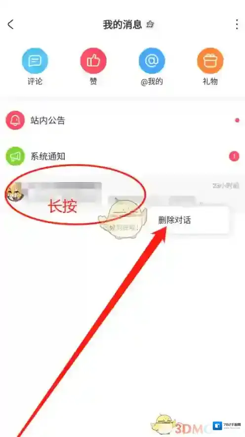 2、然后打开之后,长按对话,点击删除对话按钮,就可以删除选中的对话了。