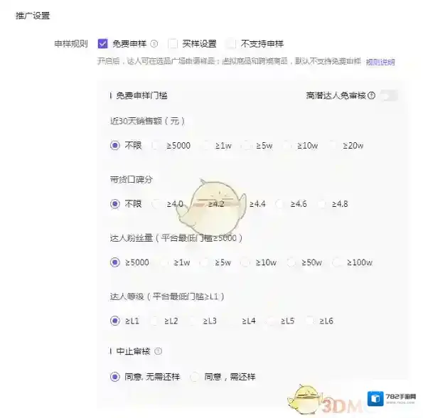 6、设置申样门槛时新手店铺建议是设置所有的产品免费申样,尽量不要设置门槛。其他有实力的店铺再另外看情况。当然具体还是要和达人进行沟通的。