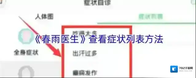 用户只需打开春雨医生APP,在主界面中找到并点击“症状自诊”功能,进入后即可看到选择“人体图”或“症状列表”的选项。点击“症状列表”,即可浏览各种症状及其对应的可能疾病,帮助用户快速定位自己或他人可能出现的健康问题,为进一步的健康咨询或就医提供参考。