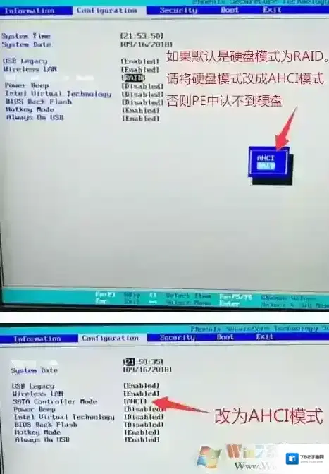 6、注意:再返回configuration这项,查看sata controller mode这项,如果默认硬盘模式为RAID,请将硬盘模式改为AHCI模式,否则进PE后不能认出硬盘,如果更改后记得按F10保存,如图: