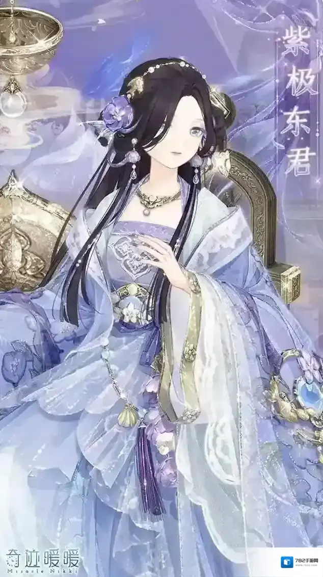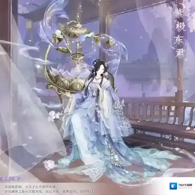紫极东君含正常姿势与特殊姿势,全新妆容“盼睐惊才”,动态特姿连衣裙“紫微星曜”,动态特姿发型“拂云分晓”,动态摆件“方水朝清”、“复礼辑乐”、“莲华鼎香”。