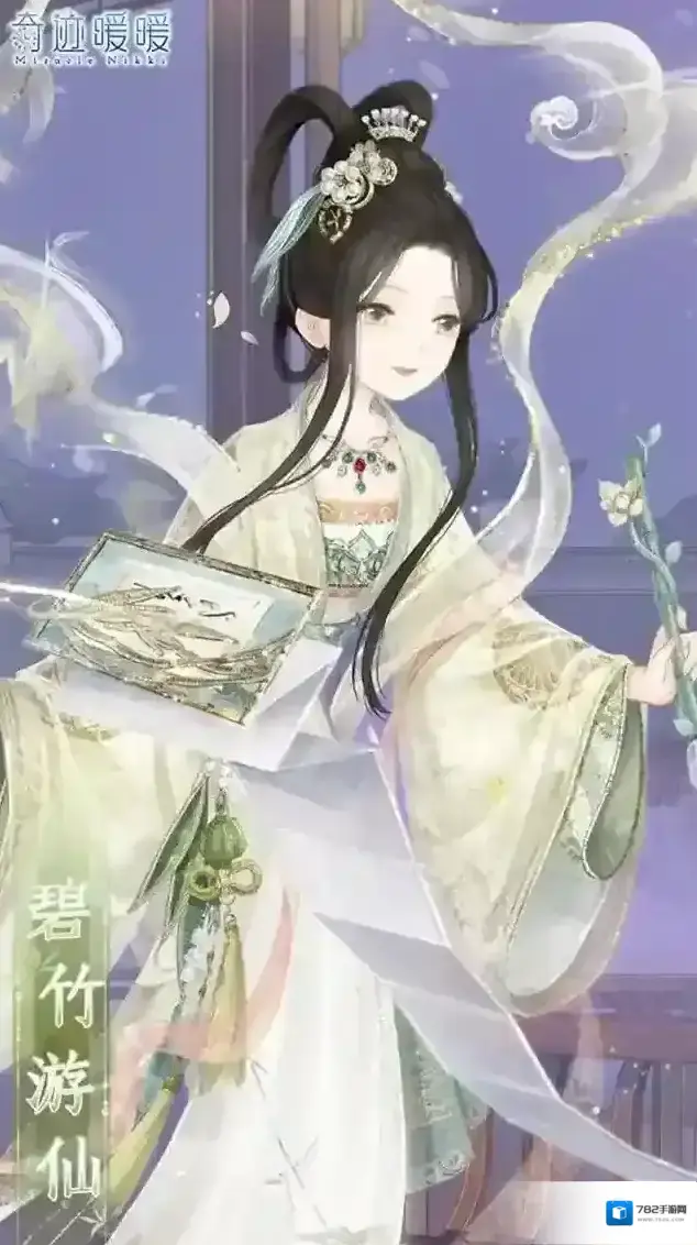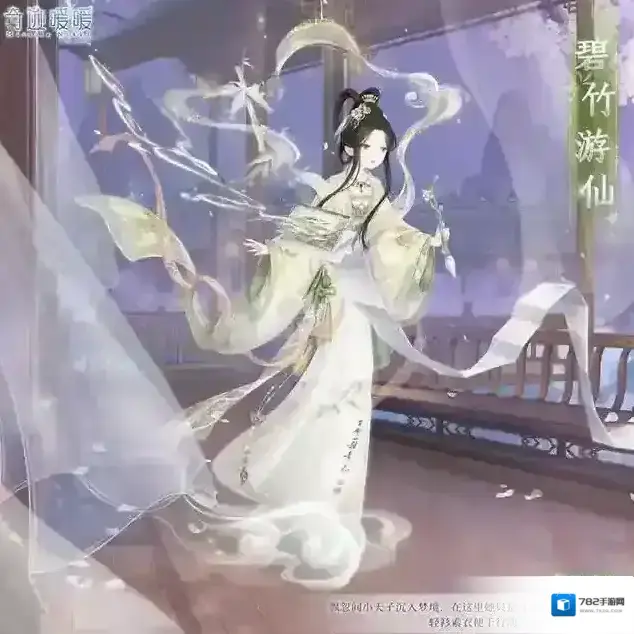 碧竹游仙含正常姿势与特殊姿势,全新妆容“笙歌未歇”,动态特姿连衣裙“碧竹篆烟”,动态特姿发型“朝阳散辉”,动态摆件“袅袅青云”、“妙载瑶编”。