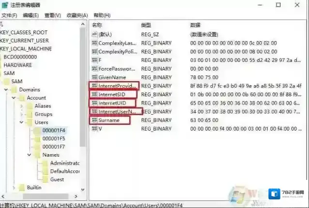 5、记下“NamesAdministrator”项默认值0x{ID},并记下ID用于3 也就是上图显示的0Xf4可能每个电脑不同哈,然后我们就可以到User下选中000001F4;存在如下几个键值数据项,对其删除。SurnameInternetUserNameInternetUIDInternetSIDInternetProviderGUID