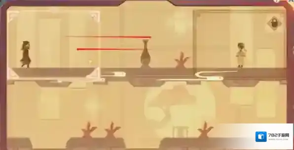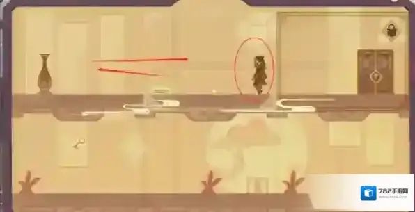 1、我们需要先等人物调头重新走到上方第二块纸幕上。