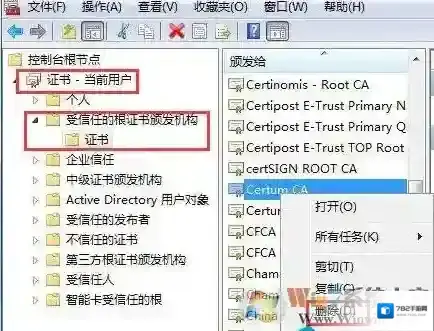 Win7系统提示安全证书过期怎么办图五6、展开“证书”=》“受信任的根证书颁发机构”=》“证书” ,在右侧列表中查找你需要删除的证书,然后在将其删除;