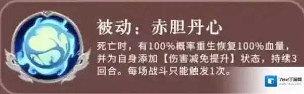 所以在需要攻击的时候周泰是可以针对敌方输出进行主要攻击的,他在技能上面有一个必杀技,叫做飞浪涛风,使用这个技能的时候,是针对敌方的一个目标进行攻击,这里的攻击百分比达到了180%,然后加上975点的固定伤害,此时还会有百分之百的伤害可以进行转化,转化的能力就是一个重伤的状态施加给敌人,在敌人身上重伤的状态会影响后面三个回合的掉血效果,那么他在被动能力上面还有一个赤胆丹心,这个技能就是周泰在被敌方击杀并导致死亡的时候,有百分百的概率会重生。