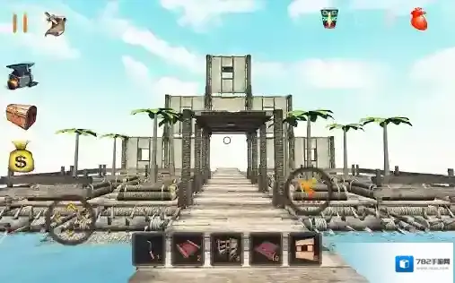 密切关注水上房屋的状况,不要让鲨鱼摧毁它。从零开始在水中建造一艘木筏,并向各个方向扩展它。木筏上的渔网、残骸收集器以及其他改进功能将帮助你装备它。