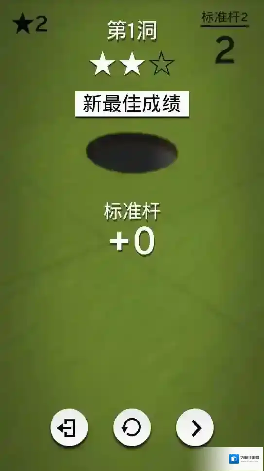 3、成绩结算完成“第1洞”,显示“新最佳成绩”“标准杆+0”,可获星级★2,推进关卡,挑战更多球洞。