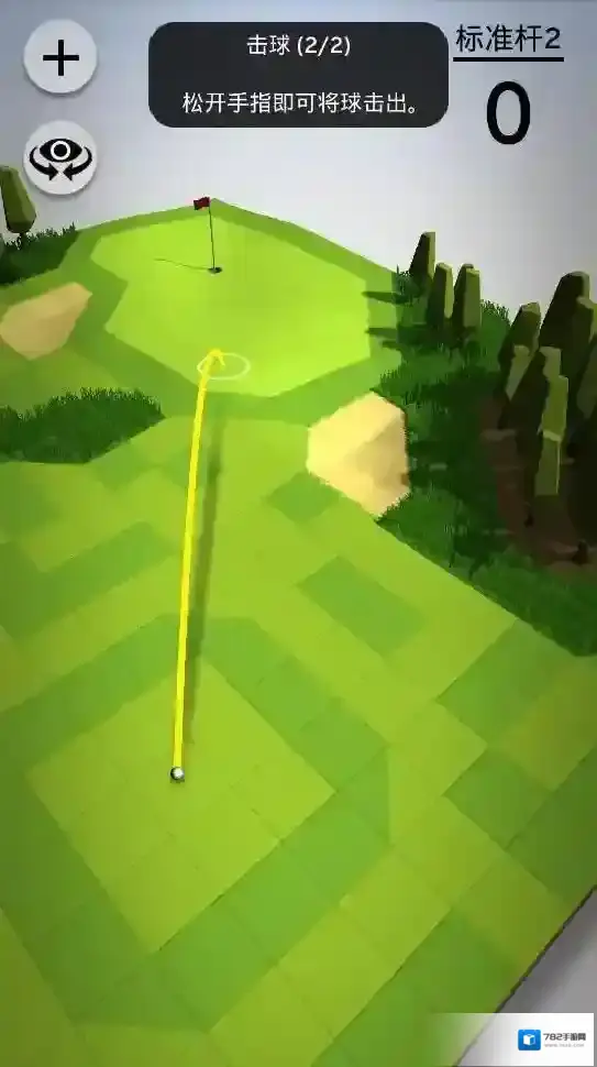 2、击球操作在高尔夫球场,拖动控制击球轨迹(黄色线),松开手指击球,完成击球2/2等步骤,让球进洞。