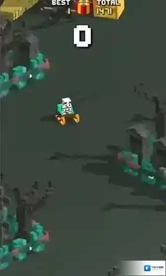 3、操作机制(控制方块车,沿路径(白色轨迹自由路线)行驶,避开障碍(树木、建筑),持续推进,解锁新场景。