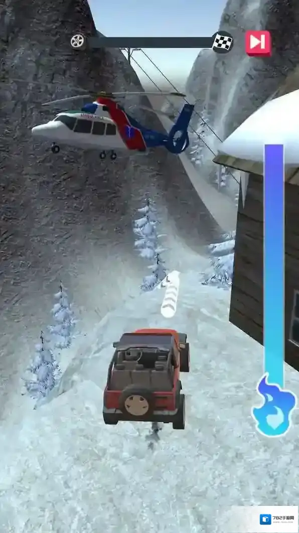 1、雪地场景驾驶越野车,避障碍(如滚木),利用加速道具冲线。