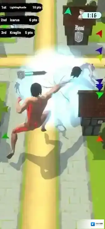 1、画面中有角色在施展技能攻击,左上角显示排名和得分信息,右上角显示倒计时“1:16”,场景中有建筑和一些标识。
