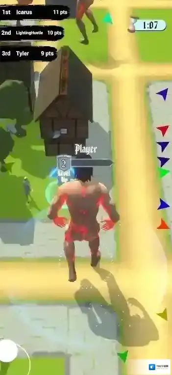 2、左上角显示玩家排名和得分,右上角显示倒计时“1:07”,画面中角色背后有特效,角色上方有“Player”标识,还显示“Levelup”(升级)。