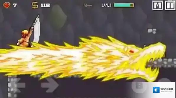 1、画面中角色正在释放火焰巨龙的技能特效,左上角显示红心数量为7,货币数量为118,等级标识为“LVL1”,底部有方向键和“A”“B”按键。