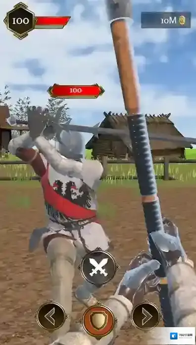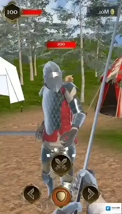 2、画面中显示两名身着盔甲的骑士在对战,上方显示双方血量均为100,下方有操作按钮,包括攻击(交叉剑图标)、盾牌防御(盾牌图标)以及方向移动按钮。